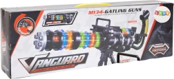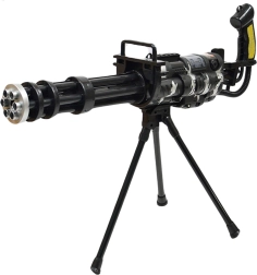 Mitraliera rotativă în stil Gatling impresionează prin execuția atentă și estetica militară pronunțată. Datorită stativului stabil, copiii se bucură de tragere cursivă fără oboseala mâinilor, în timp ce iluminarea LED și vibrațiile conferă acțiunii o atmosferă autentică. Mânerul ergonomic și greutatea redusă permit țintirea și controlul ușor.