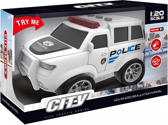 Pornește acțiunea cu mașina de poliție albă cu mecanism cu fricțiune, care, după tensionare înapoi, pornește înainte. Copiii vor fi atrași de efectele luminoase și sonore realiste, care adaugă autenticitate jocului. Datorită dimensiunilor compacte de 22,5 × 11,5 × 14 cm, se ține bine în mână și se manevrează ușor.