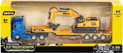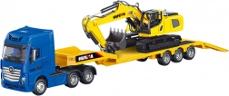 Acest set fidel realizat include un cap tractor albastru cu semiremorcă joasă și un excavator galben, care împreună simulează transportul real al utilajelor de construcții. Structura metalică combinată cu ABS oferă rezistență la deteriorare și durabilitate îndelungată atât la joacă, cât și la expunere în colecție.