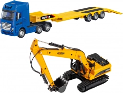 Capul tractor cu semiremorcă joasă și excavatorul permit simularea transportului real al echipamentelor grele – ideal pentru joc creativ și vitrine de colecție.