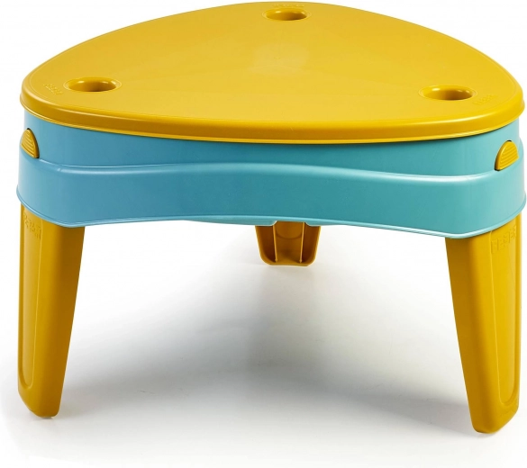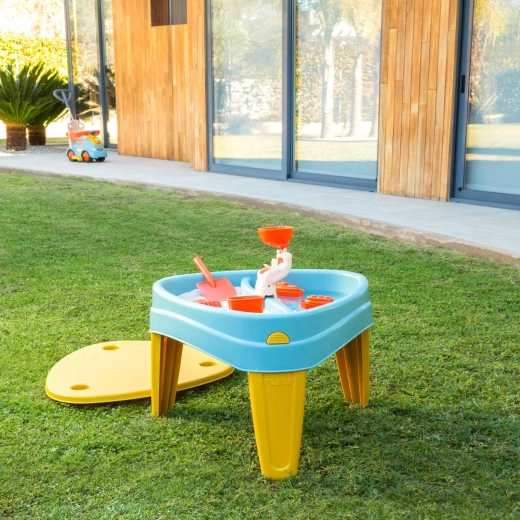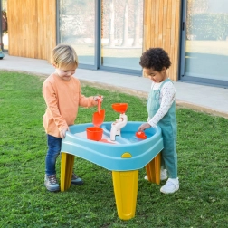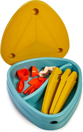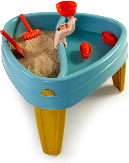 Construcția cu picioare mai groase asigură stabilitate ridicată, iar marginile rotunjite oferă utilizare sigură chiar și pentru cei mai mici. Plasticul de calitate cu protecție UV păstrează culorile intense mult timp. În pachet veți găsi și 5 accesorii utile pentru săpat, umplut și experimente cu apă.