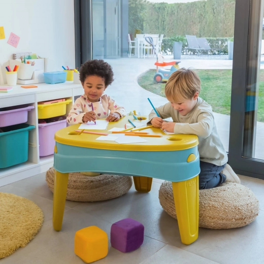 Capacul montabil creează în câteva clipe o suprafață plană pentru desen și protejează conținutul mesei de murdărie. Decupajele integrate păstrează creioarele și mărunțișurile la locul lor.
