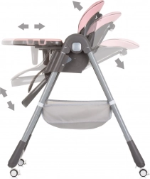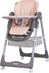 Scaun de masă practic și confortabil pentru copii până la 15 kg, cu dotări superioare pentru mese sigure și liniștite. Oferă 4 poziții ale spătarului, 7 trepte de înălțime ale șezutului, suport de picioare reglabil și piele ECO moale pentru întreținere ușoară. Siguranța este asigurată de centură în 5 puncte și de o construcție stabilă cu roți pentru mutare facilă. Include tavă dublă, bară cu jucării și coș de depozitare.