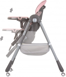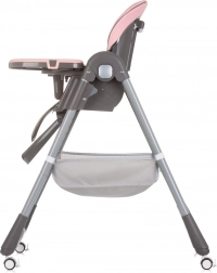 Tava dublă practică, cu partea superioară detașabilă, facilitează servirea și curățarea. Siguranța este asigurată de centura în 5 puncte cu căptușeală și de tija în formă de T a tăvii de bază. Datorită celor 4 roți, scaunul se mută ușor prin casă, iar coșul de depozitare găzduiește jucării și accesoriile pentru hrănire. Plierea compactă economisește spațiu acasă și în călătorii.