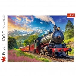 Puzzle Călătoria cu Trenul cu 1000 de piese, care înfățișează o locomotivă cu aburi gonind printre munți. După asamblare, rezultă o imagine cu dimensiunile 683 x 480 mm.