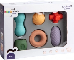 Acest set este conceput pentru explorarea naturală a lumii prin joc. Suprafațele și formele variate stimulează simțul tactil, văzul și mișcarea, sprijinind capacitățile cognitive și curiozitatea. Materialul moale și elastic este plăcut la atingere și blând cu palmele copiilor, fiind sigur și în timpul mușcatului.