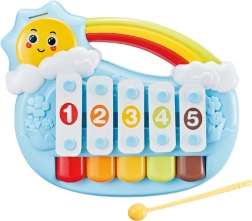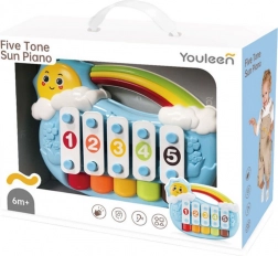 Pianină drăguță în formă de soare zâmbitor, oferă 5 tonuri pe care copiii le pot reda ușor printr-o atingere delicată. De la 6 luni, sprijină dezvoltarea simțurilor, motricitatea fină și percepția ritmului. Include 3 foi cu melodii, culorile vii atrag atenția, iar finisajul sigur cu margini rotunjite este ideal pentru cei mici. Practicul mâner de prindere ușurează transportul acasă și în călătorii.