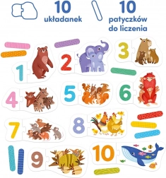 Acest set educațional colorat este ideal pentru copiii de vârstă preșcolară care se familiarizează cu numerele. Fiecare puzzle din două piese conține ilustrații cu animale și cifra corespunzătoare – sarcina este să le potrivești corect. Datorită bețișoarelor de numărat puteți îmbogăți învățarea cu activități jucăușe suplimentare și să consolidați înțelegerea cantităților.