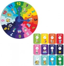 Puzzle educativ colorat în formă de ceas pentru copii de la 3 ani, inspirat de serialul COCOMELON. Ajută la dezvoltarea motricității fine, a recunoașterii formelor și culorilor și îi familiarizează pe cei mici cu bazele citirii orei într-un mod distractiv.