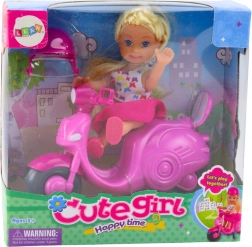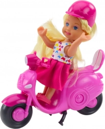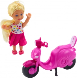 Păpușa are înălțimea de 11 cm, păr blond lung și o ținută drăgălașă. Scuterul este confectionat din plastic rezistent, dotat cu roți și oglinzi mobile. Setul include și o cască roz, care asigură siguranța în timpul mersului și adaugă realism.