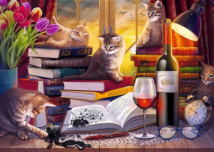 Descoperiți un motiv elegant plin de detalii – pisicuțe jucăușe într-o bibliotecă, care va încânta iubitorii de animale și pe pasionații exigenți de puzzle-uri. Datorită celor 2000 de piese, vă veți bucura de ore îndelungate de distracție, dezvoltând răbdarea și concentrarea. Suprafețele cu hârtie calandrată, care reflectă lumina, îmbunătățesc claritatea motivului și fac asamblarea mai confortabilă.
