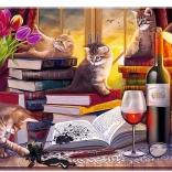 - Motiv: pisicuțe printre volume de cărți – detaliat, colorat și decorativ