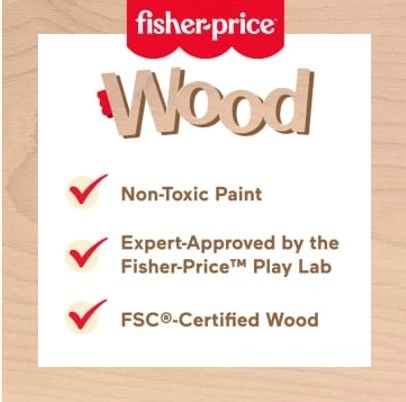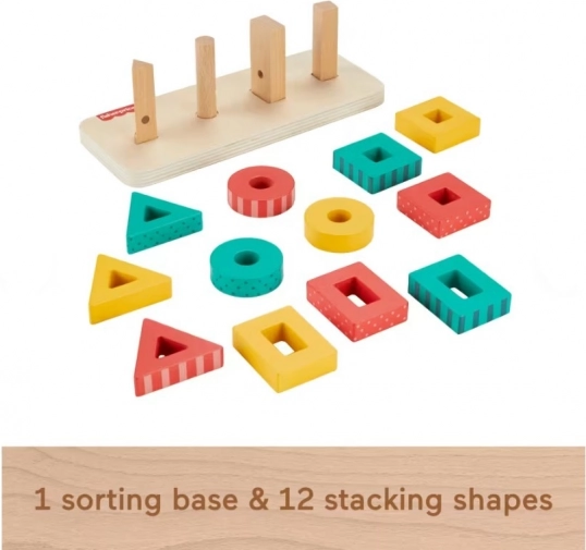 Sorter de forme din lemn FISHER-PRICE din lemn FSC cu 12 forme. Vopsele sigure pe bază de apă, dezvoltă motricitatea și logica. Ideal de la 2 ani.