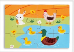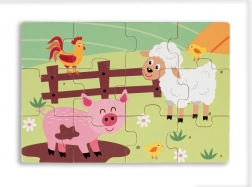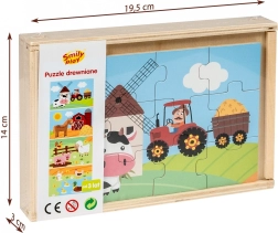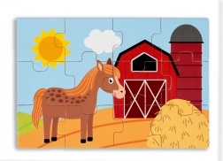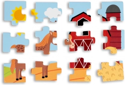 Puzzle din lemn pentru copii cu tema vieții la țară. Acest set conține patru imagini color care ilustrează viața rurală.