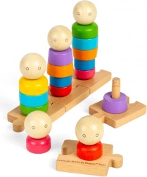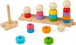 Acest set din lemn cu piese de înșirat aduce copiilor bucuria descoperirii prin joc. Cinci tije separate pe un suport tip puzzle permit construirea de figurine variate din inele colorate și căpșoare cu fețe. Datorită pieselor interschimbabile, copiii pot explora formele, culorile și ordinea, exersând totodată răbdarea și gândirea logică.