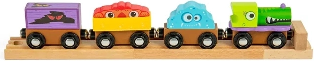 Trenuleț din lemn distractiv pentru micii iubitori de creaturi înfricoșătoare – locomotivă și trei vagoane cu încărcătură detașabilă, două șine și un opritor. Compatibil cu majoritatea seturilor de trenulețe din lemn. Fabricat din lemn certificat FSC și finisat cu vopsele netoxice pentru joacă în siguranță. Susține creativitatea, abilitățile lingvistice și coordonarea mână-ochi.