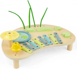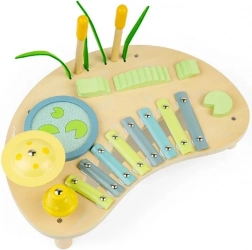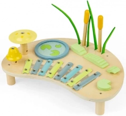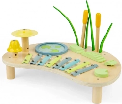 Sunt incluse instrumente integrate: xilofon cu lamele metalice, tobă în formă de iaz, o pereche de clopoței și elemente ritmice care amintesc de un crocodil. Două baghete din lemn facilitează jocul și îi încurajează pe copii să experimenteze cu ritmul și tempoul. Produsul este realizat responsabil din lemn certificat FSC și finisat cu vopsele netoxice.