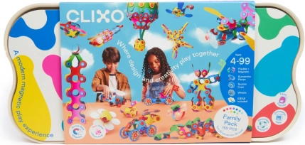CLIXO Family Party este un set mare pentru întreaga familie și pentru joaca în grup. Datorită sistemului magnetic patentat, cu mișcare de rotație la 360° și fixare în 24 de poziții, creațiile tale rămân ferme și stabile. Din piese elastice, multiaxiale, poți construi cu ușurință modele 2D și 3D – de la animale și vehicule la arhitectură și proiecte științifice.