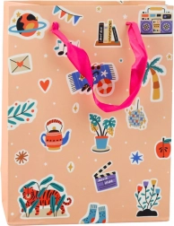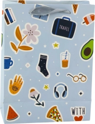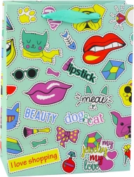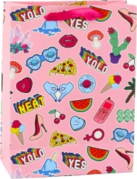Geanta cadou cu imprimeu autocolante combină diverse elemente grafice precum inimi, buze, fructe și inscripții, oferindu-i un aspect tineresc și original. Fabricată din carton decorativ solid, garantează transportul în siguranță chiar și pentru cadouri mai grele.