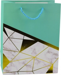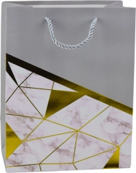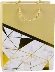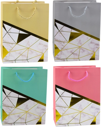 Geanta de cadou elegantă cu design modern este alegerea perfectă pentru orice ocazie – de la aniversări și jubileuri la nunți și evenimente sociale. Fabricată din carton decorativ de calitate, se remarcă prin combinația stilată de modele geometrice cu efect de marmură și linii aurii. Aceste linii metalice aurii adaugă un caracter luxos și transformă geanta într-un ambalaj de cadou elegant.