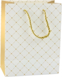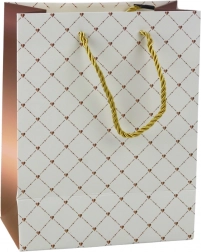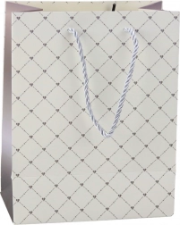 Această pungă de cadou elegantă este alegerea ideală pentru ambalarea unui cadou special. Fabricată din hârtie de înaltă calitate, punga se mândrește cu un model delicat și stilat sub forma unei grile fine cu accente strălucitoare, care îi adaugă un caracter unic și elegant. Datorită designului universal, este potrivită pentru diverse ocazii - de la aniversări și sărbători la evenimente sociale.
