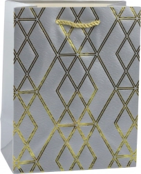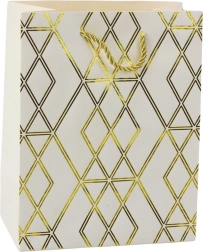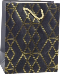 Modelul geometric cu linii aurii se potrivește perfect cu fundalul negru profund, adăugând caracter sofisticat întregului design. Această pungă este alegerea perfectă pentru zile de naștere, aniversări, sărbători și alte ocazii speciale.