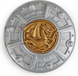 Scutul și armura cu emblemă de dragon auriu, realizate cu detalii fine, conferă costumului un aspect impresionant și accentuează caracterul cavaleresc.
