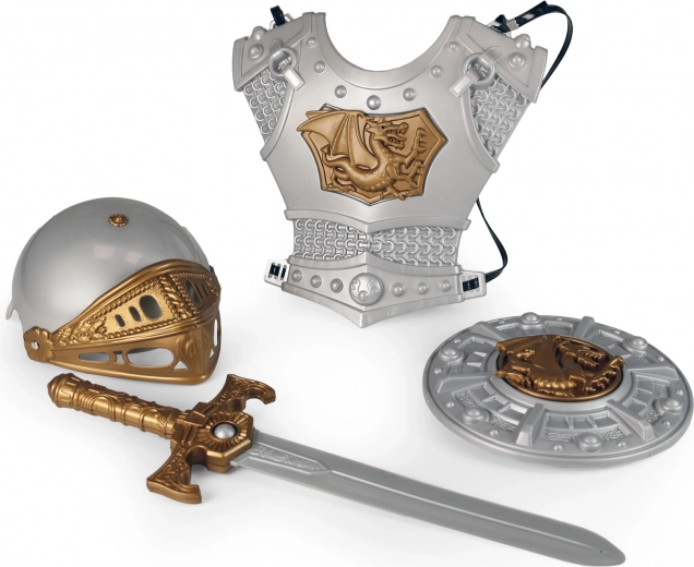 Casca, armura, sabia și scutul formează un set unitar cu care copilul este pregătit pentru orice aventură – de la carnaval la bătălii acasă.