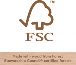 Ca semn al producției durabile, jucăria poartă certificatul FSC, care confirmă utilizarea responsabilă a resurselor forestiere.