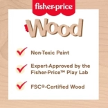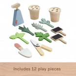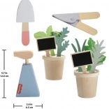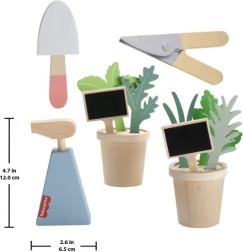 Setul din lemn pentru grădinărit pentru copii conține 12 piese, incluzând: 2 ghivece cu frunze și plante din lemn, o lingură de joacă, o foarfecă de joacă, o sticluță cu pulverizator și 2 tăblițe pentru etichetarea plantelor. Produsul este realizat din lemn certificat Forest Stewardship Council (FSC-N004566) și este decorat cu vopsele netoxice pe bază de apă.