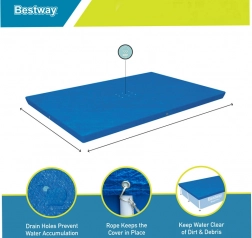 Husa Bestway este concepută pentru a proteja eficient piscina dumneavoastră împotriva insectelor, frunzelor, păsărilor și a ploii ușoare. Datorită frânghiilor de fixare solide, este rezistentă la vânt, iar orificiile de drenaj din husă împiedică acumularea apei. Husa oferă izolație termică suplimentară apei din piscină.