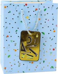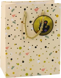 Această pungă cadou îmbină designul elegant cu durabilitatea practică. Bulinele fine, modelele florale și vegetale sunt completate de detalii aurii lucioase și un etichetaj inclus cu motive de cărți, calculator sau paletă de pictură. Datorită dimensiunilor 32 × 26 × 12 cm, încape confortabil cadouri mici până la medii.