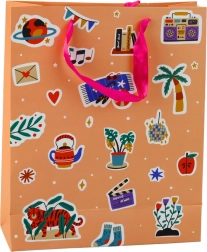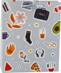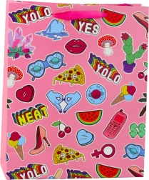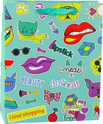 Punga cadou originală cu imprimeu de autocolante colorate și inscripții la modă atrage atenția de la prima vedere. Culorile vii și designul în tendințe o fac un accesoriu grozav pentru cadouri destinate atât tinerilor, cât și adulților. Datorită dimensiunilor de 32 × 26 × 12 cm, găzduiește confortabil cadouri mici și medii.
