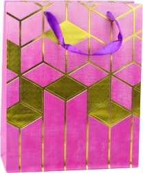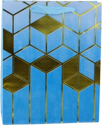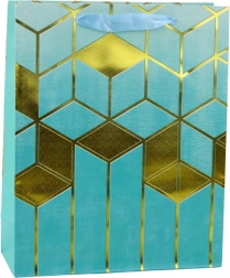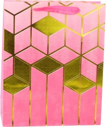 Această pungă cadou elegantă îmbină designul modern cu practicitatea. Este decorată cu motifuri geometrice aurii pronunțate și culori intense, care o transformă într-un ambalaj reprezentativ pentru orice cadou. Cartonul decorativ rezistent și mânerele din șnur durabile asigură transport confortabil și sigur.