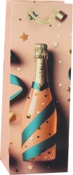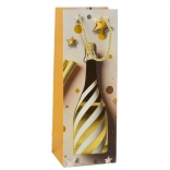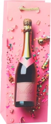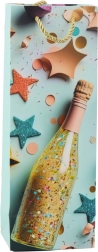 Pungă cadou elegantă din hârtie pentru sticlă, cu motiv de șampanie, ideală pentru oferirea cu stil a vinului sau a spumantului la orice sărbătoare. Oferă carton decorativ rezistent, mânere împletite aurii și design festiv cu confeti și stele în culori pastel. Perfectă pentru zile de naștere, nunți, Revelion și alte momente deosebite.