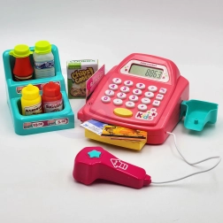 Sunt incluse și raftul cu articole, bancnote, monede, card de plată și o cutie de „biscuiți”, astfel încât copiii își pot crea propriul mini-magazin. Jocul dezvoltă comunicarea, motricitatea fină, creativitatea și imaginația.