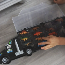Setul mare pentru copii de la Woopie combină camionul, geantă portabilă și lansator de mașinuțe într-un singur produs. Oferă un ansamblu tip tractor de 50 cm lungime cu 24 compartimente de depozitare și ușițe transparente, care păstrează în siguranță dinozaurii, animăluțele și vehiculele la locul lor. Jucărie ideală pentru copiii de la 3 ani, pentru joacă creativă și organizată acasă sau în călătorii.