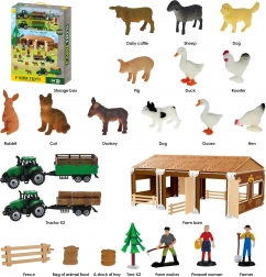 - 12 figurine de animale, 3 figurine de oameni, 2 tractoare cu remorci detașabile, hambar/zagrodă, țarcuri și alte accesorii pentru fermă