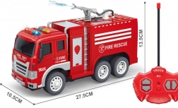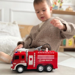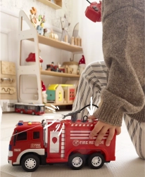 Jucăria imită o adevărată mașină de pompieri datorită efectelor sonore, luminoase și de apă.