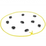 - Conținut: 20 de pietricele magnetice de forme diferite, șnur galben pentru delimitarea suprafeței de joc, săculeț textil, instrucțiuni