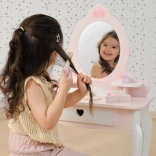 - Măsuță de toaletă cu oglindă, taburet, paletă cu pensulaș, ruj, 2× lac de unghii, parfum, pieptene, pensulă pentru pudră, uscător