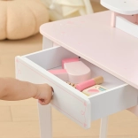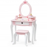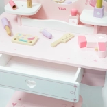 Sertarul practic și polițele laterale ascund toate comorile. Include un set bogat de accesorii din lemn: paletă cu pensulaș, ruj, lacuri de unghii, parfum, pieptene, pensulă pentru pudră moale și uscător. Jucăria are margini netede și o suprafață tratată cu vopsele netoxice pentru joacă în siguranță.