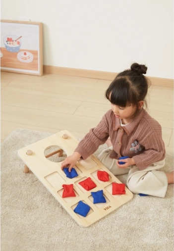 Setul include săculeți textili moi în două culori (roșu și albastru) pentru diferențiere ușoară a echipelor. Copiii își exersează prin aruncare motricitatea fină, abilitățile de coordonare și răbdarea, iar adulții vor aprecia regulile rapide și competiția dinamică.