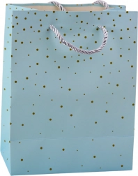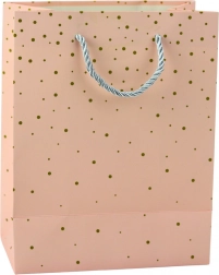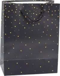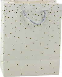 Această pungă cadou din hârtie, cu buline aurii, este un accesoriu atemporal pentru ambalarea elegantă a cadourilor. Cartonul decorativ rezistent își păstrează forma și arată impecabil chiar și la utilizări repetate, în timp ce mânerele din șnur asigură un transport confortabil și sigur.