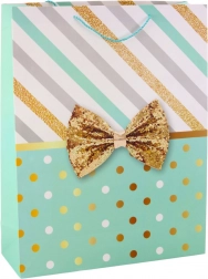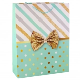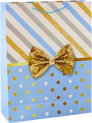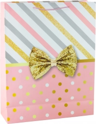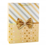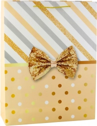 Pungă mare de cadou cu un design unic de dungi și buline în culoare aurie, completată de o fundă decorativă.