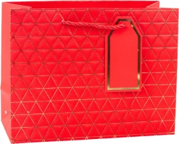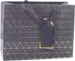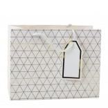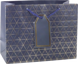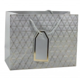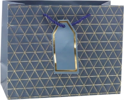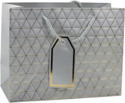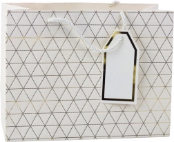 Această pungă cadou modernă se remarcă printr-un model geometric în formă de triunghiuri, decorat cu linii aurii. Este disponibilă în șase variante de culori elegante: alb, albastru, argintiu, roșu, gri și antracit. Fiecare pungă este echipată cu mâner din șnur asortat și pandantiv pentru personalizare.