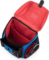 Setul include și un săculeț practic pentru echipament sportiv sau încălțăminte, care se închide ușor prin strângerea șnururilor. Penarul cu un singur compartiment și două clapete fără conținut are bucle elastice pentru prinderea rechizitelor și o folie transparentă pentru orarul școlar, utilă în planificarea școlară.
