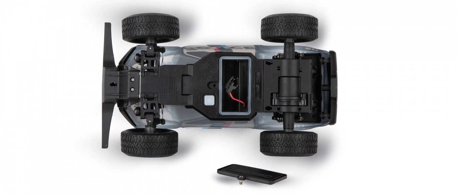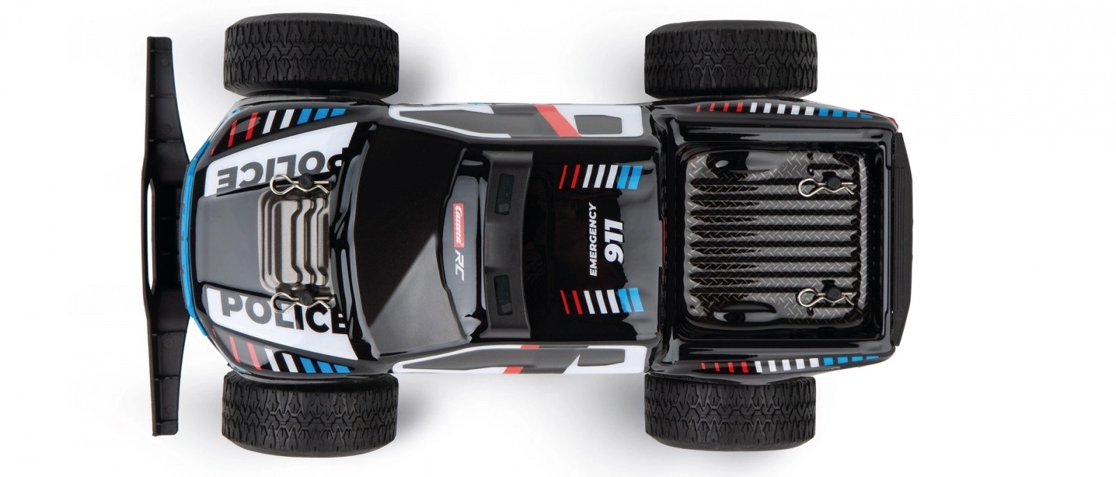 Suspensia roților amortizează eficient denivelările și asigură stabilitate și confort pe covor, trotuar sau teren ușor. Roțile mari, profilate, și barele de protecție robuste fac față condusului dinamic și schimbărilor bruște de direcție, astfel că modelul este ideal pentru curse și urmăriri polițienești atât în interior, cât și în exterior.