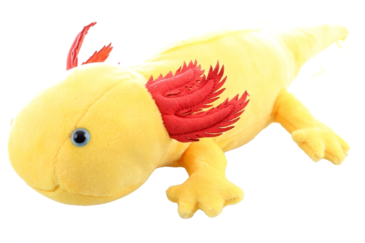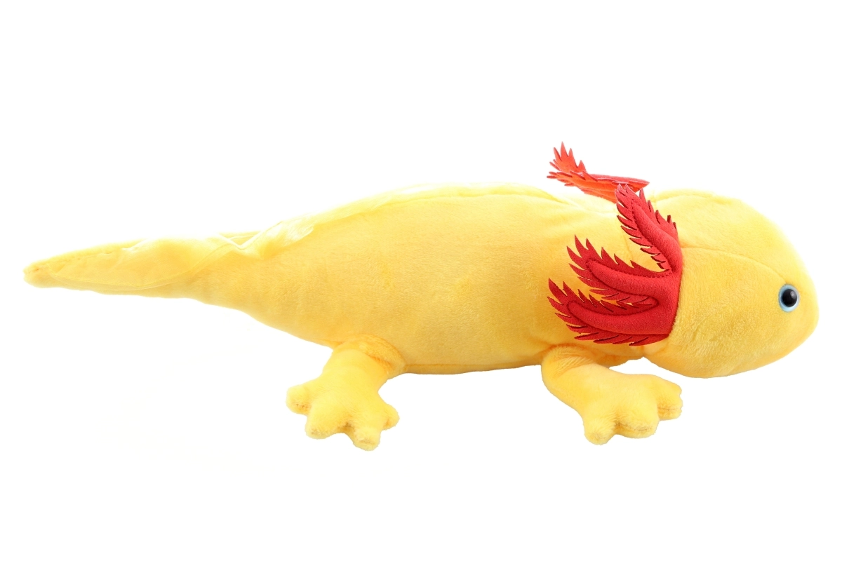 Corp galben cu branhii externe roșii și cusături atent lucrate transformă axolotlul într-o decorațiune fermecătoare și o jucărie pe placul tuturor.