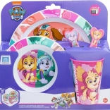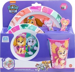 Set de masă pentru copii 5în1, drăguț și practic, cu motiv PAW PATROLimprimării colorate. Conține farfurie, bol, linguriță, furculiță și pahar. Setul este fără BPA și paharul este potrivit pentru microunde (600 W / 2 min).